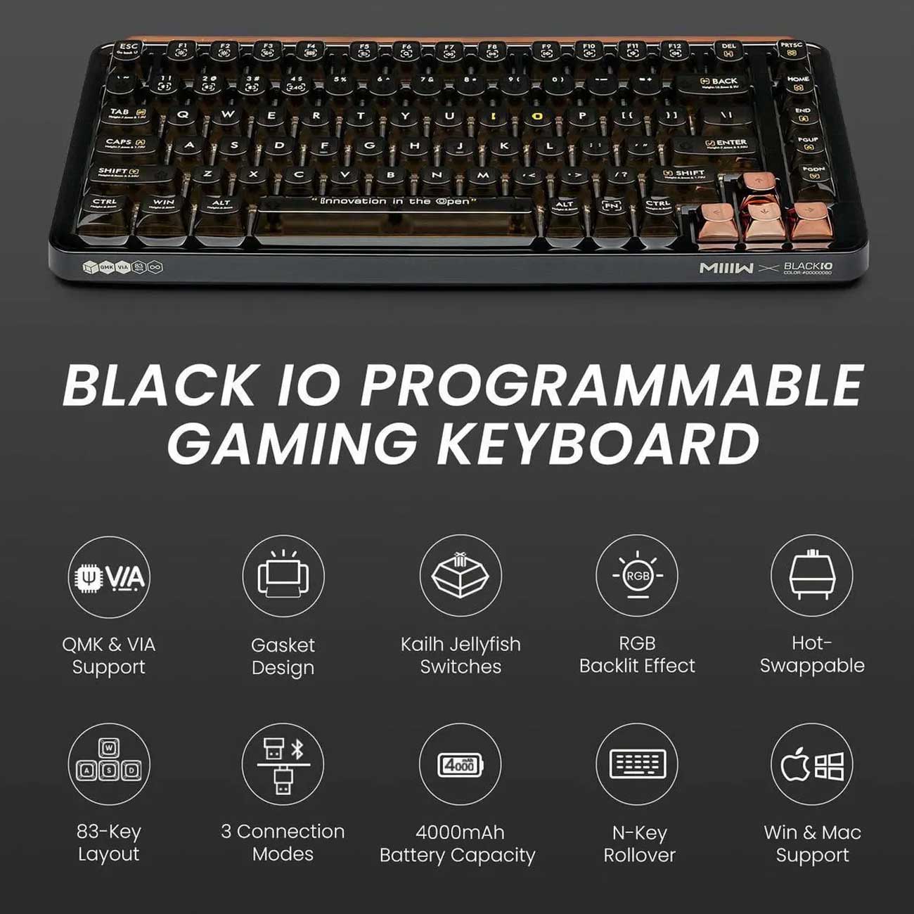 کیبورد مکانیکی با سوئیچ Kailh که ساخت MIIIW بوده و از زیر مجموعههای برند شیائومی است یکی از انتخابهای محبوب کاربران حرفهای است و مدل BLACK IO با استفاده از سوئیچهای Kailh Jellyfish شفاف تجربهای بینظیر ارائه میدهد. این سوئیچها با ویژگی Self-lubricating عملکردی روان و نرم دارند و با Pretravel معادل 1.9±0.5mm و فشار عملکرد 48±10 gf، برای تایپ سریع و اجرای دستورات دقیق در بازیها ایدهآلاند. دوام بالا تا 50 میلیون بار فشردهسازی، این سوئیچها را به گزینهای مطمئن برای استفاده طولانیمدت تبدیل کرده است.