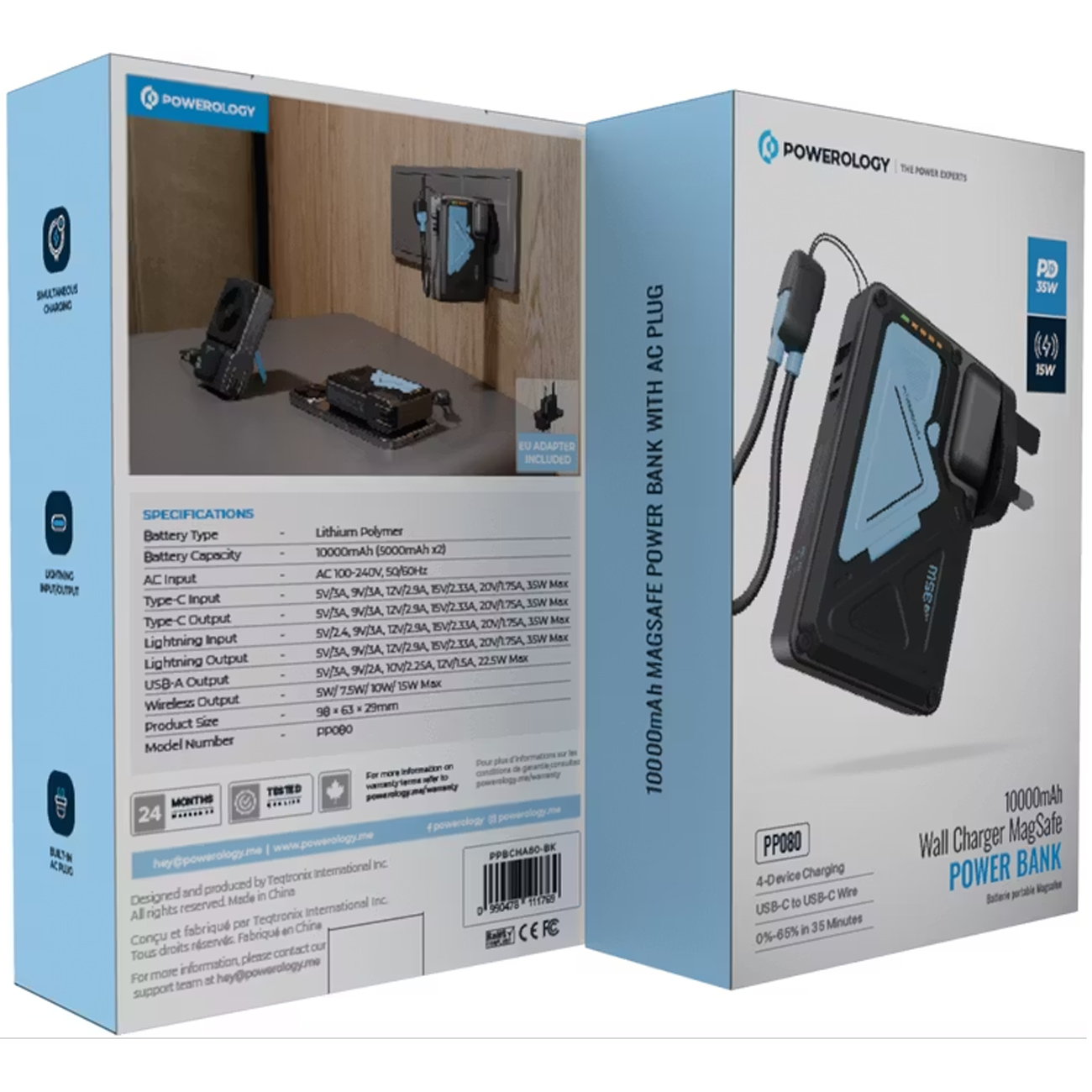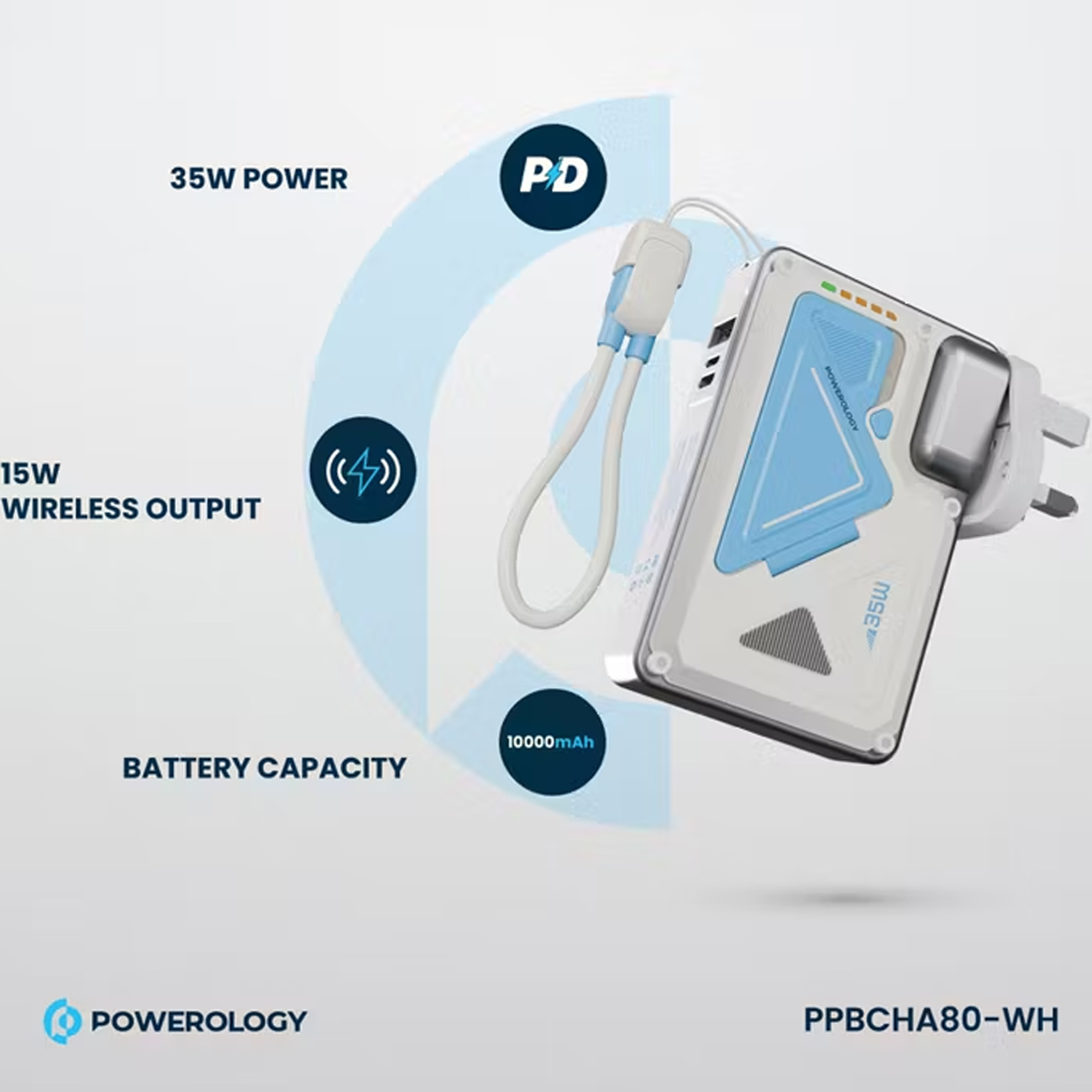 پاوربانک 10000 وایرلس و شارژر دیواری Type-C، USB و لایتنینگ فست شارژ 35 وات پاورولوژی Powerology PPBCHA80
