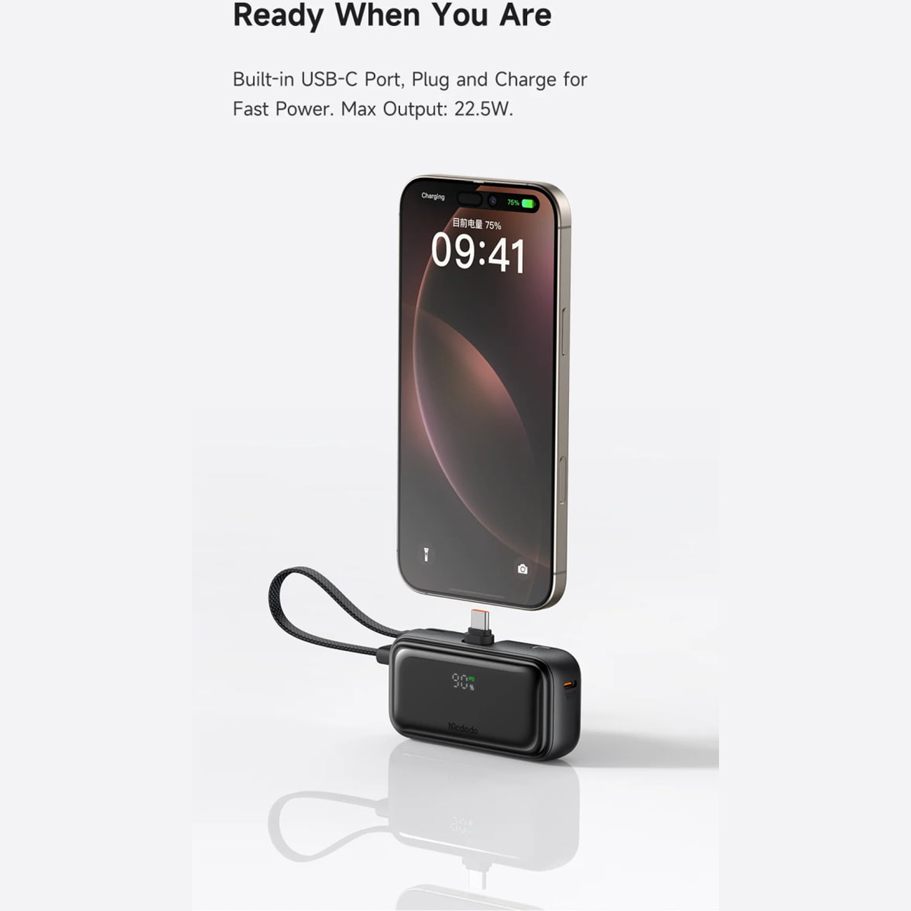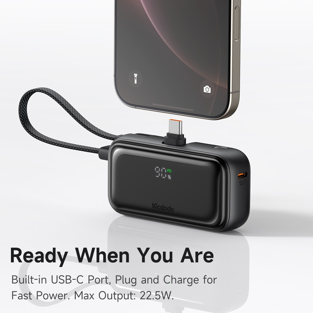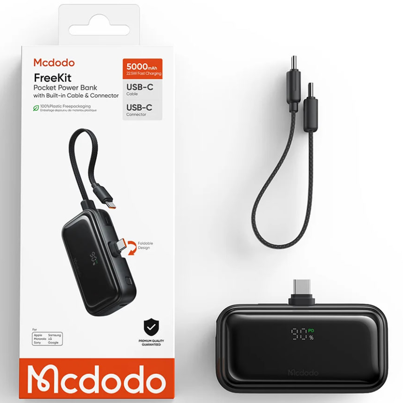 پاوربانک جیبی مک دودو مدل MC-7760 مجهز به کابل داخلی Type-C قابل جدا شدن، کانکتور USB-C تاشو و پورت USB-C است که هر کدام از قابلیت شارژ سریع 22.5 وات پشتیبانی میکنند. ورودی کابل USB-C تا 18 وات امکان شارژ سریع پاور بانک را فراهم میکند و خروجی کابل USB-C و پورت USB-C تا 22.5 وات، توانایی شارژ دستگاههای مختلف مانند گوشی، هدفون و تبلت را دارد. شدت جریان و ولتاژ ورودی: 5V⎓3A، 9V⎓2A، 12V⎓1.5A (18W Max)، شدت جریان و ولتاژ خروجی کابل USB-C: 5V⎓3A، 9V⎓2.22A، 10V⎓2.25A، 12V⎓1.67A (22.5W Max)، و خروجی پورت USB-C: 5V⎓2.4A، 9V⎓2.22A، 10V⎓2.25A، 12V⎓1.67A (22.5W Max) است.