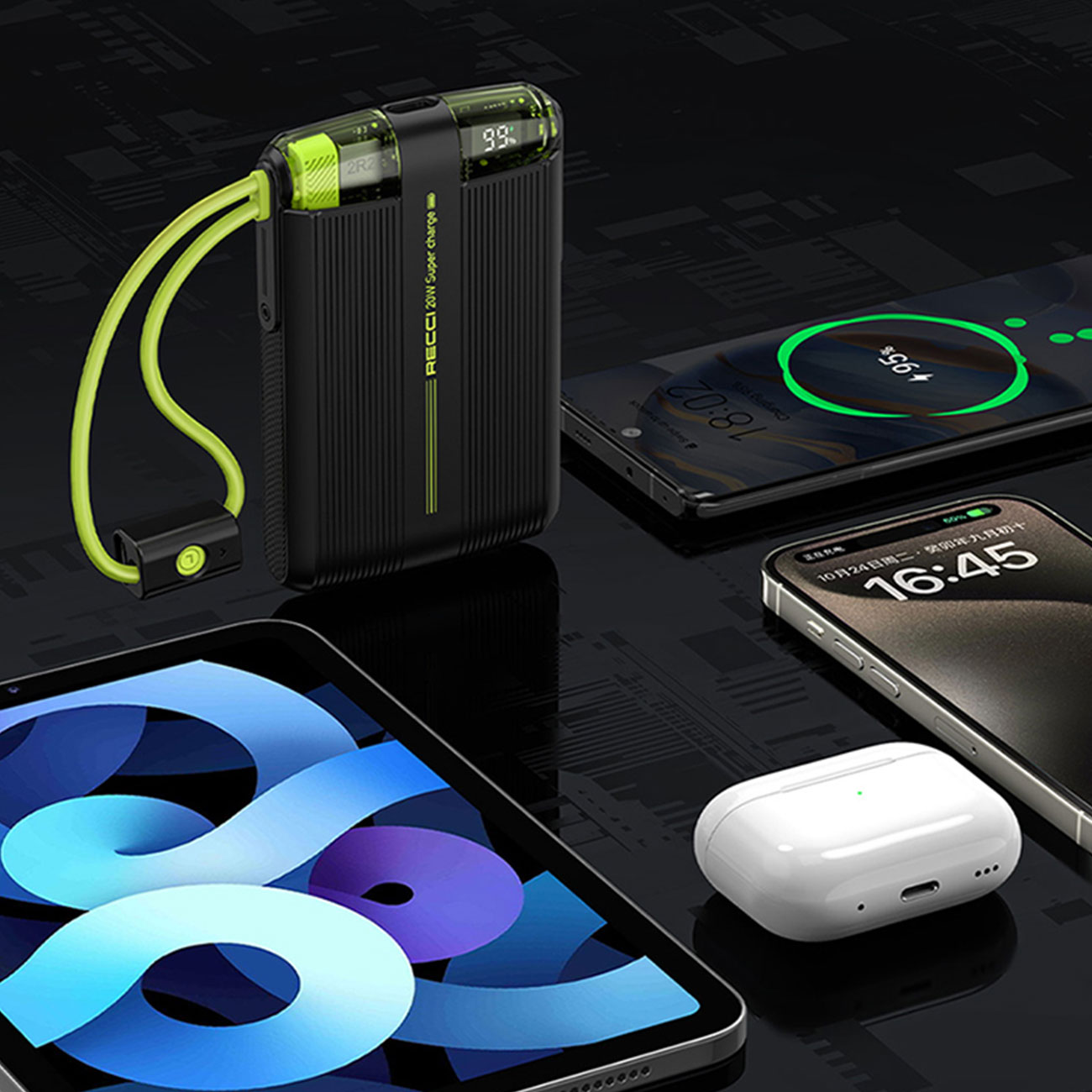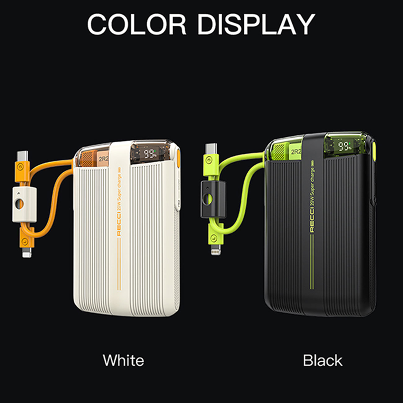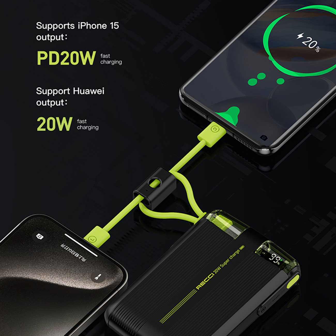 یکی از کاربردی ترین ویژگی های این پاور بانک وجود کابل شارژ تایپ سی و کابل شارژ لایتنینگ است که به خود بدنه پاوربانک با طراحی منحصر به فرد و خلاقانه متصل شده است و از مهمترین قابلیت های این پاوربانک که در دنیای دیجیتالی رو به رشد امروز، قابلیت شارژ سریع است که باعث صرفه جویی در زمان می شود. این پاوربانک برند رسی از شارژ سریع با توان حداکثر PD20W گوشی آیفون 15 با کابل لایتنینگ خود و از شارژ سریع 20 وات گوشی های هواوی با کابل تایپ سی متصل روی خود پشتیبانی می کند.