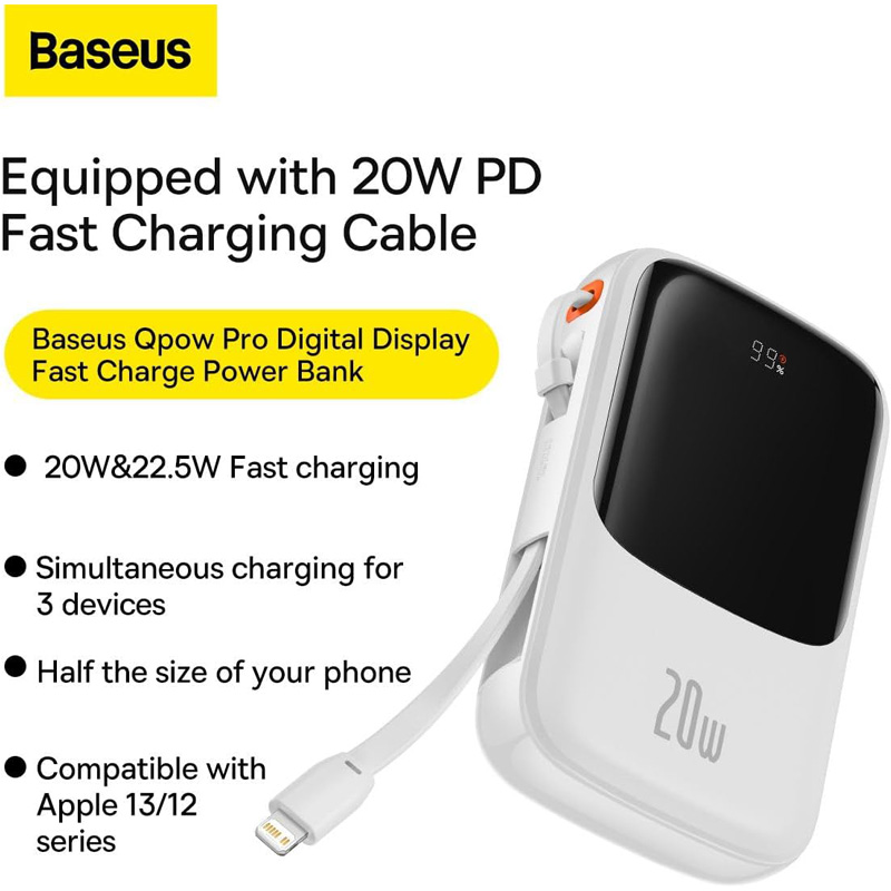 پاوربانک بیسوس Qpow Pro با دارا بودن یک کابل لایتنینگ 30 سانتی متری متصل به بدنه و یک درگاه USB-A , USB-C در کنار یک پورت اختصاصی به عنوان ورودی از نوع لایتنینگ است که به شما امکان می دهد تا حداکثر 3 دستگاه را به طور همزمان شارژ کنید. کابل LIGHTNING می تواند گوشی آیفون 14 شما را با توان 2O وات و گوشی سامسونگ S 23 یا آیفون 15 را با توان 20 وات به صورت فست شار نماید.