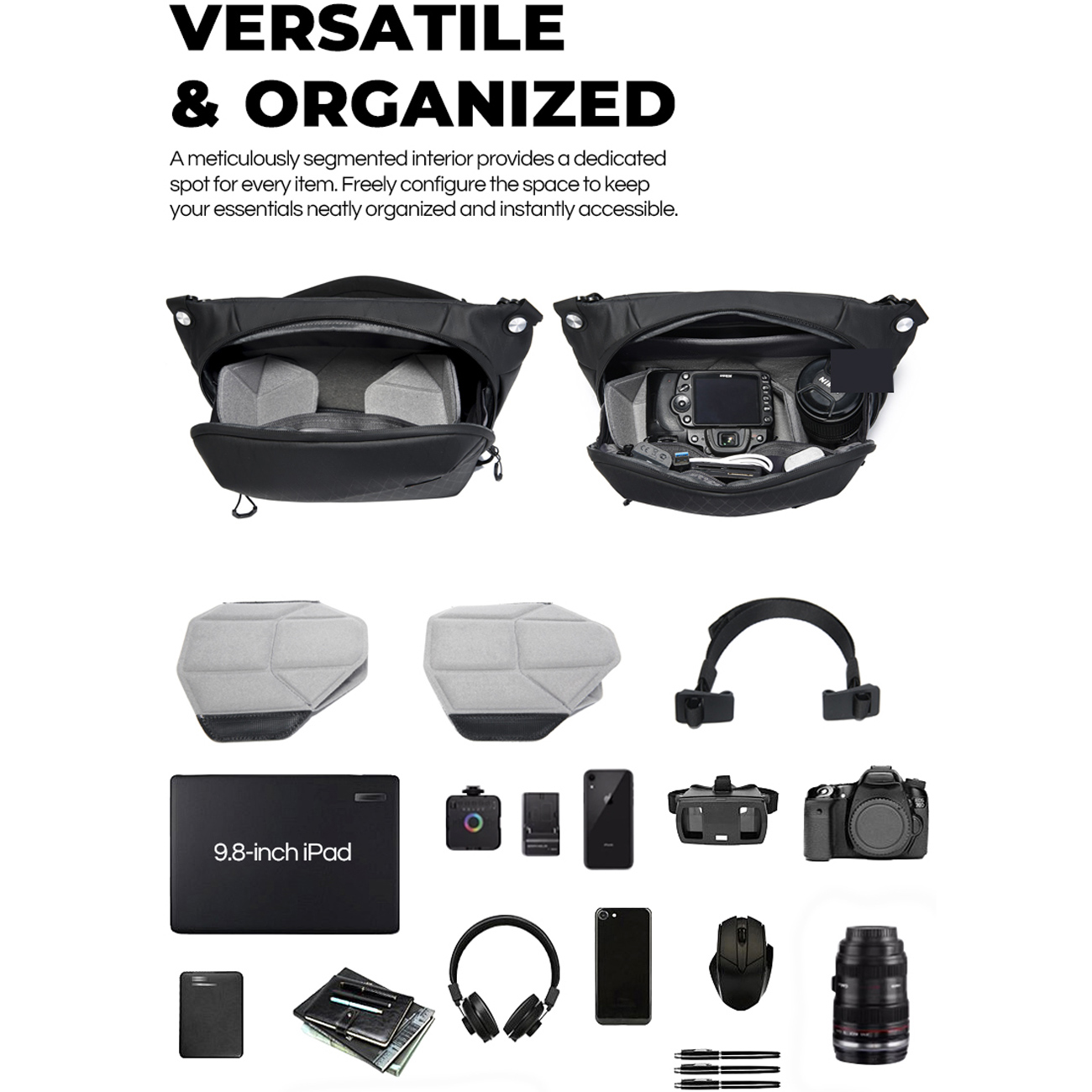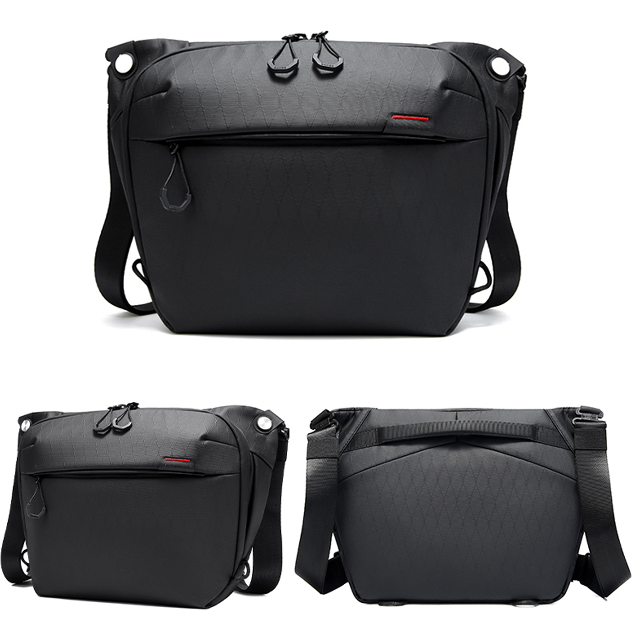 وجود جیب لنز، جیب اصلی، جیب زیپی و جیب های سازماندهی شده باعث می شود همه وسایل شما همیشه مرتب و قابل دسترس باشند. طراحی آینده نگرانه FUTURE AESTHETICS در کنار رنگ مشکی کلاسیک، کیف دوشی دوربین بنج را هم برای استفاده حرفه ای و هم روزمره مناسب کرده است.